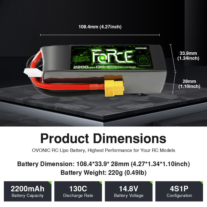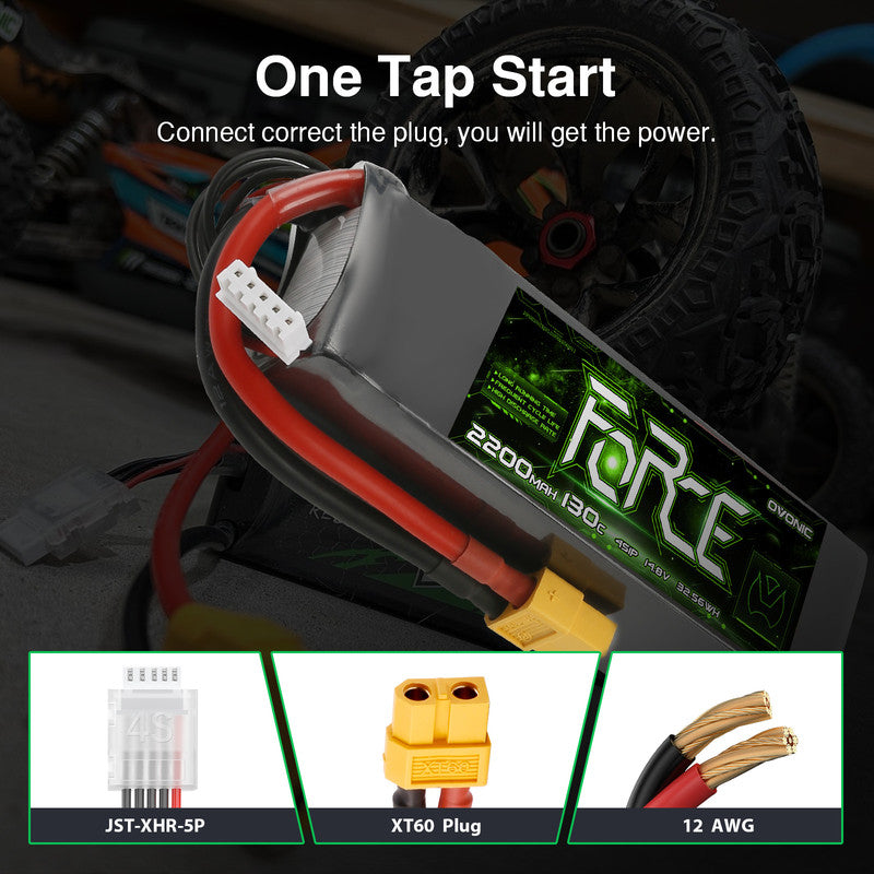 OVONIC Force Series 4S 2200mAh 130C LiPo Battery is the versatile high-output solution designed for RC enthusiasts who demand top-tier performance on land and in the air. This single pack provides the sheer force required across three major RC hobbies: Cars, FPV, and Aviation.