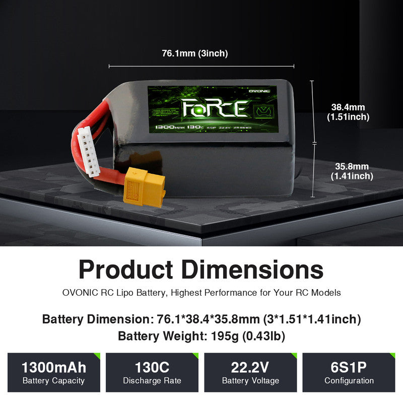 Ovonic 130C 6S 1300mah Lipo Battery with XT60 plug has full capacity and discharge rate. It is a high discharge rate FPV racing lipo battery. The 130C gives you enough power under load. It is very compact in size and very light in weight. Works perfectly with your powerful FPV 3inch and also 4inch copters.