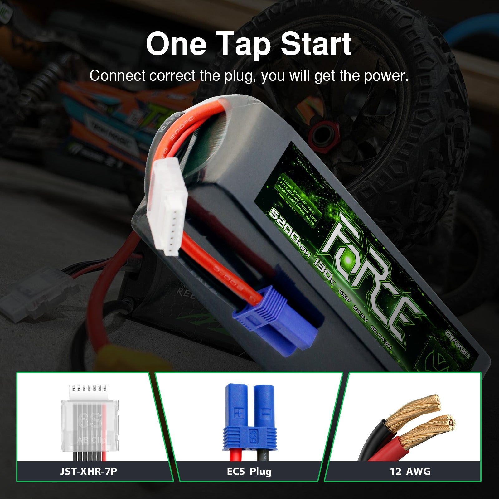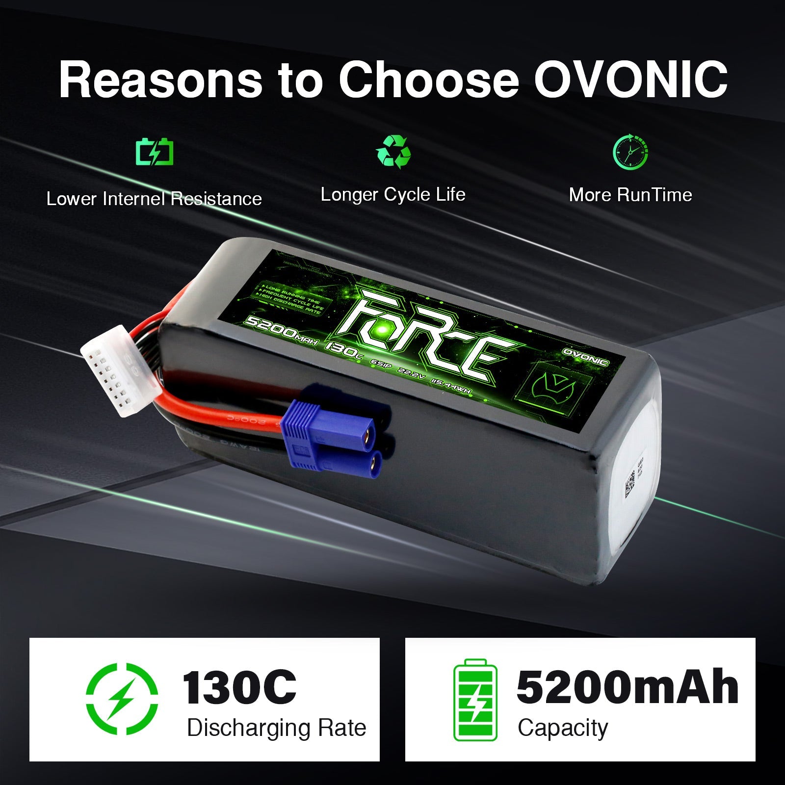 OVONIC Force Series 6S 5200mAh 130C LiPo Battery is meticulously engineered for high-performance RC applications where maximum power-to-weight ratio and flexibility are paramount. This battery delivers an intense 22.2V 6S configuration, boasting an industry-leading 130C continuous discharge rate and a staggering 260C burst capability. As a high-capacity Soft Case pack, it is optimized to provide the low weight and flexibility needed for superior flight dynamics and speed runs, while maintaining steady voltage and punchy acceleration.