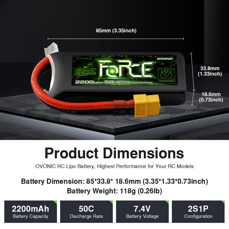 Ovonic 2200mAh 2S LiPo batteries is the ideal power solution for 1/16 and 1/18 scale TRA RC cars. Offering a 50C discharge rate and 7.4V configuration, these 2S LiPo batteries ensure optimal balance between power and endurance. Whether you're racing or off-roading, these batteries provide long-lasting performance, keeping your RC car going without interruption. With 2200mAh capacity of these 2S LiPo battery packs guarantees extended run times, while the combination of XT60 and TRX plugs gives you the flexibility to use them across a wide variety of 1/16 and 1/18 scale vehicles.