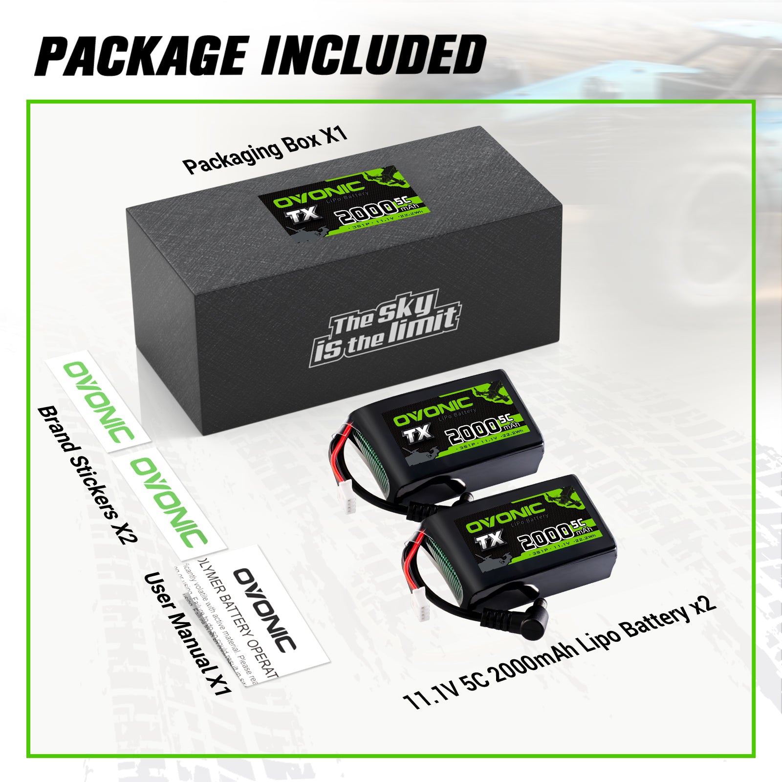 2-Pack Ovonic 3S 2000mAh 5C 11.1V LiPo Battery w/DC55 Plug for RC Transmitters and Receivers