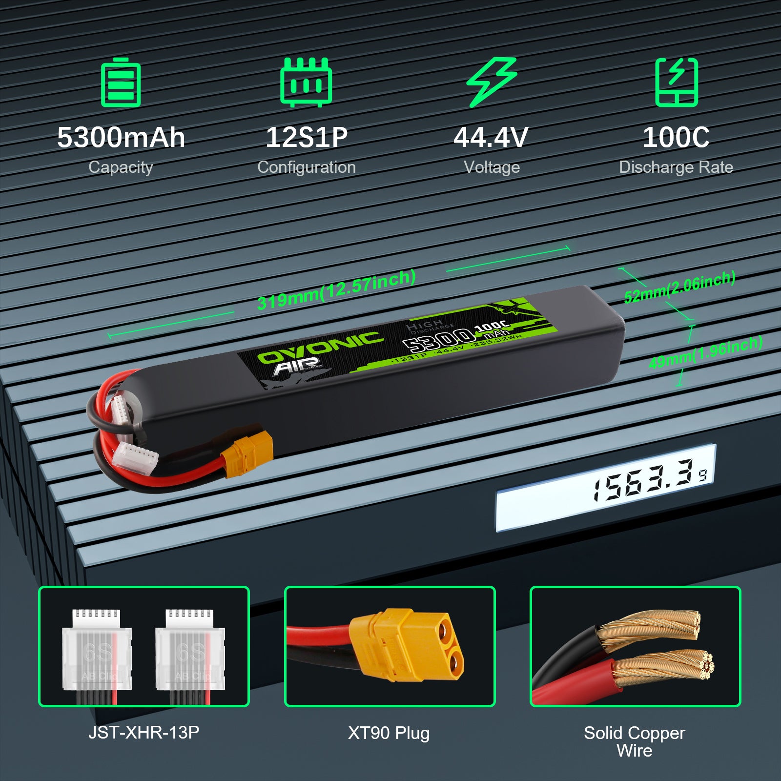 • 1 x OVONIC 12S 5300mAh 44.4V 100C Softcase LiPo Battery with XT90 Plug